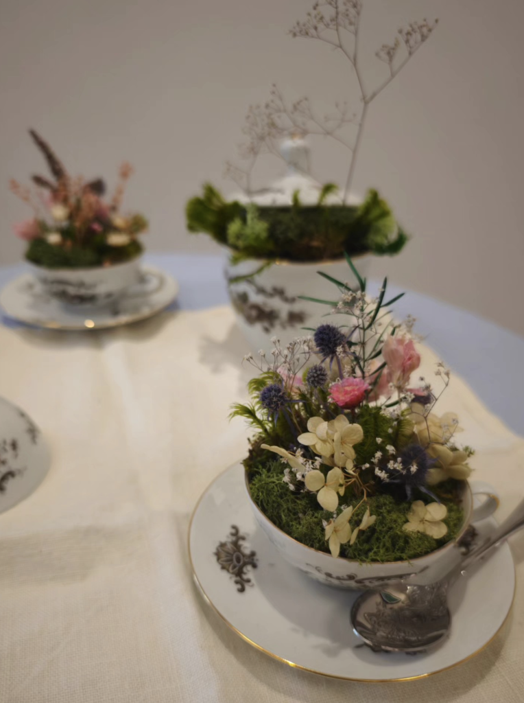 Le long du mur qui accueille ces photographies se déploie une autre scène. Une table de jardin et ses deux chaises, accompagnées de quelques tasses délicatement envahies par la nature, créées par l’artiste Morgan Etes, composent comme une clairière au cœur de l’exposition. Ce dispositif n’est pas un simple décor, il ouvre un imaginaire. Il renvoie aux jardins du merveilleux, aux contes de l’enfance, à l’univers d’Alice au pays des merveilles, où l’échelle vacille, où le quotidien bascule dans l’étrange, où l’on entre dans un monde parallèle sans quitter tout à fait le réel. Le visiteur laisse alors derrière lui le monde des hommes et les bruits de la rue pour pénétrer un espace suspendu, entre hospitalité et dérèglement.