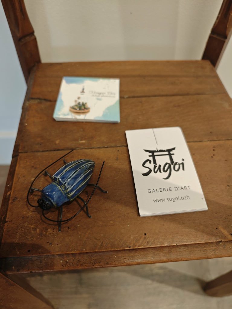 À la frontière du visible, un autre veilleur apparaît encore, presque en secret. Dans les interstices de l’exposition, dissimulés sous la table, dans la végétation ou au détour d’un socle, de minuscules insectes en céramique créés par Delphine Schreiber infiltrent l’espace. Leur présence discrète accentue le caractère naturaliste de l’ensemble, tout en introduisant une mémoire plus ambiguë de notre rapport à la nature : celle d’un temps où l’homme n’hésitait pas à épingler les insectes sur des planches entomologiques pour faire admirer leurs carapaces rutilantes ou chamarrées. Ici, cette histoire n’est pas rejouée littéralement ; elle est déplacée. L’insecte n’est plus capturé, classé, exhibé. Il se soustrait au regard direct, attend d’être découvert, persiste dans les marges de notre attention. Paradoxalement, ce sont peut-être eux, ces êtres presque invisibles, les véritables veilleurs du jardin.