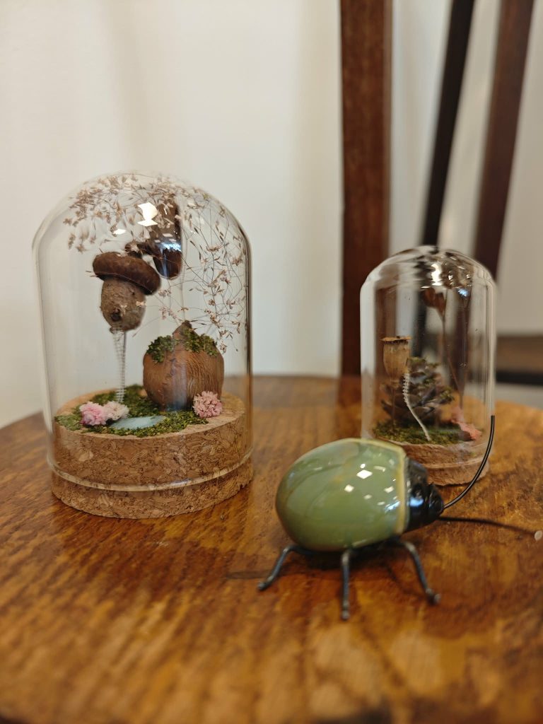 Autour de cet espace central, sous cloche, se déploient des microcosmes. Présentées à différentes hauteurs, les architectures miniatures de Morgan Etes rejouent, en réduction, les dynamiques du vivant. Leur forme convoque l’histoire des cabinets de curiosités, où le monde était rassemblé en fragments — coquillages, insectes, fossiles, objets rares — pour être observé, ordonné, rendu intelligible. Mais ces cloches renvoient aussi à une autre histoire : celle des serres, des terrariums et des dispositifs d’expérimentation scientifique. Elles rappellent ces instruments grâce auxquels on isolait un fragment du réel pour mieux l’étudier. Jean-Henri Fabre lui-même utilisait ce type de procédé pour observer la mante religieuse. Ici, toutefois, l’outil d’observation se transforme en objet d’art. Le dispositif expérimental devient forme plastique. Ce qui relevait de l’analyse devient expérience sensible.