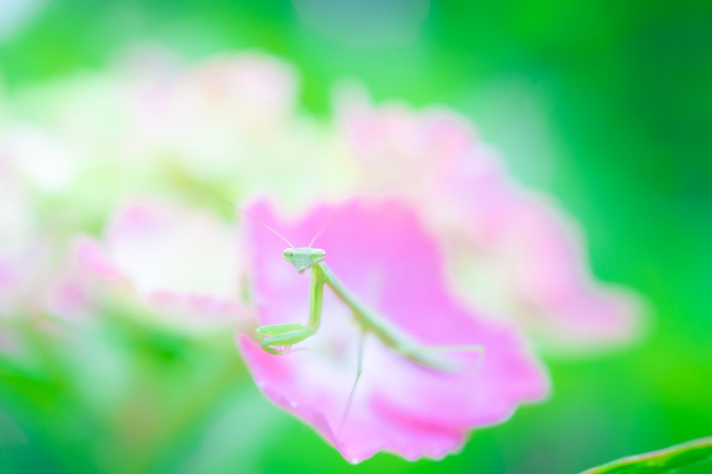 Mais ici, le visiteur est à la fois celui qui regarde et celui qui est regardé. Car dans cette exposition, le regard n’est pas univoque : il est réversible. Maurice Merleau-Ponty écrivait que voir, c’est aussi être vu, que la perception est toujours une affaire de relations. Le monde n’est pas face à nous ; nous sommes pris dedans. Dans ce jardin artificiel installé dans la galerie, les mantes ne sont pas uniquement les sujets des photographies, elles en deviennent aussi les actrices silencieuses, guettant chaque activité humaine jusque dans les moindres détails du jardin du photographe. Yutaka Takahashi ne voyage pas loin pour faire le portrait de ses chères mantes : il les observe dans son propre jardin, guettant leurs pontes, photographiant leurs premiers instants, leurs premières luttes avec les autres insectes du jardin, leurs formes de symbiose avec les hortensias et les autres fleurs, jusqu’à leur mort quelques mois plus tard. C’est un cycle de vie entier qui se joue à l’échelle du jardin.